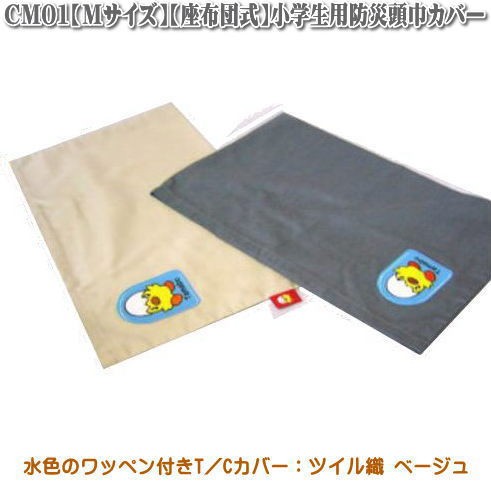 CM01【Mサイズ用】防災頭巾入れ 防災頭巾カバー T/Cカバー 座布団式 ベージュ 水色ワッペン付き 小学生用 防災頭巾カバー