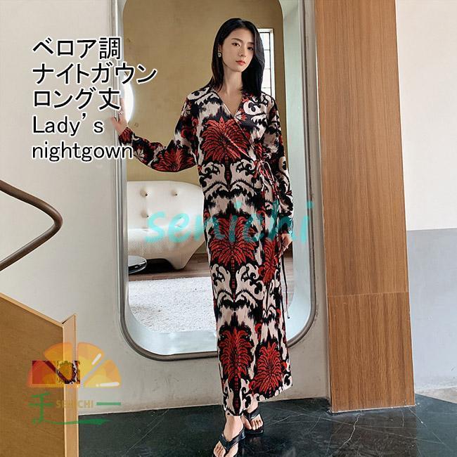 ナイトガウン レディース ルームウエア ベロア調 Vネック 長袖 ロング丈 前開き 光沢感 柔らかい 着心地抜群 ゆったり 体型カバー シンプル 春秋 女性用 入院 お泊り 旅館 旅行 部屋着 寝巻き ナイトウエア バスローブ ネグリジェ