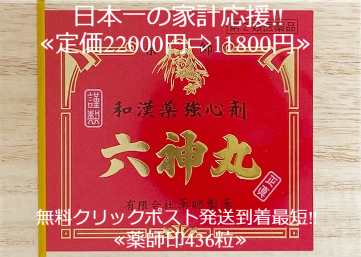 12時までの注文で本日発送!当製品は電子プライスで他店価格よりタイムリーに値下げ対応し時価最安値で販売しています。販売価格はタイムリーに変わりますのでご理解のほどよろしくお願いいたします。薬師印六神丸436粒 定価22000円 第2類医薬品医薬品につきましては、ご本人のみご購入頂けます。ギフトによる注文はお受けできません。予告なく成分・パッケージが変更になることがございます。※第2類医薬品【薬師印六神丸の働き】強心作用のあるセンソや、ゴオウなどの生薬を配合した強心薬で動悸、息切れ、気付けに効果をあらわします。【効能・効果】動悸、息切れ、気付け【用法・用量】大人(15才以上)1回2粒、1日2回朝夕に水又は白湯にて服用して下さい。【ご注意】・直射日光の当たらない湿気の少ない涼しい所に保管してください。・小児の手のとどかない所に保管してください。・他の容器に入れ替えないでください。 (誤用の原因になったり品質が変わります。)【成分・分量(1日量4粒)】ゴオウ……………………2.0mgセンソ……………………5.0mgニンジン末………………2.2mg沈香末……………………2.3mg牛胆………………………3.0mgd−ボルネオール ………1.0mg添加物としてサリチル酸、寒梅粉、カルボキシメチルセルロースカルシウム、薬用炭を使用しています。【使用上の注意】●してはいけないこと(守らないと現在の症状が悪化したり、副作用が起こりやすくなる)本剤を服用している間は、次の医薬品を服用しないで下さい。他の強心薬■相談すること1.次の人は服用前に医師、薬剤師又は登録販売者に相談して下さい。(1)医師の治療を受けている人。(2)妊婦又は妊娠していると思われる人。2.服用後、次の症状が現れた場合は副作用の可能性があるので、直ちに服用を中止し、この文書を持って医師、薬剤師又は登録販売者に相談して下さい。[関係部位:症状]消化器:吐き気・嘔吐3.5〜6日間服用しても症状がよくならない場合は服用を中止し、この文章を持って医師、薬剤師又は登録販売者に相談して下さい。【製品に関するお問い合わせ】有限会社薬師製薬〒930-0044 富山県富山市中央通り3−1−15お問合せ先:076-495-5995受付時間:10時から17時まで(土・日・祝祭日を除く)【広告文責】【店舗販売業開設証の内容について】氏名(名称):薬粧yamazaki名 称:yamazaki japan店舗運営責任者:山崎 昌敏TEL:076-483-3244