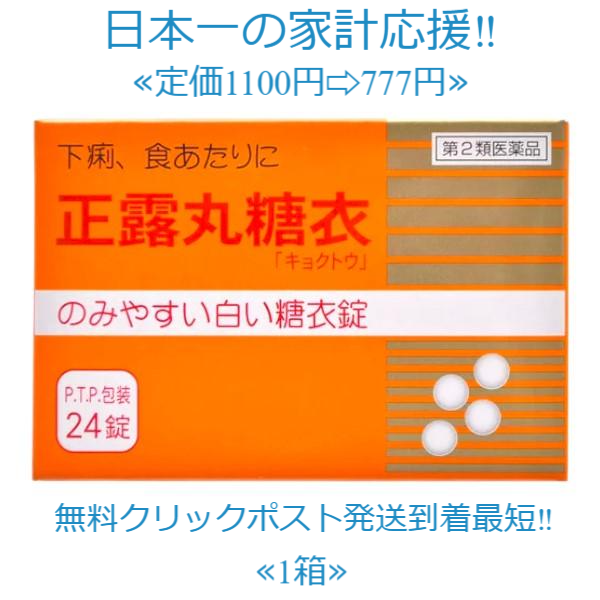 当製品は電子プライスで他店価格よりタイムリーに値下げ対応し時価最安値で販売しています。 販売価格はタイムリーに変わりますのでご理解のほどよろしくお願いいたします。正露丸糖衣キョクトウ【使用上の注意】■相談すること1.次の人は服用前に医師,薬剤師又は登録販売者に相談してください。 (1)医師の治療を受けている人。 (2)発熱を伴う下痢のある人,血便のある人又は粘液便の続く人。 (3)急性の激しい下痢又は腹痛・腹部膨満・はきけ等の症状を伴う下痢のある人。 (本剤で無理に下痢を止めるとかえって病気を悪化させることがあります。) (4)高齢者。2.服用後,次の症状があらわれた場合は副作用の可能性があるので,直ちに服用を中止し,この文書を持って医師,薬剤師又は登録販売者に相談してください。[関係部位:症状]消化器:食欲不振,胃部不快感まれに次の重篤な症状が起こることがあります。その場合は直ちに医師の診療を受けてください。[症状の名称:症状]肝機能障害:全身のだるさ,黄疸(皮ふや白目が黄色くなる)等があらわれる。3.5〜6日間服用しても症状がよくならない場合は服用を中止し,この文書を持って医師,薬剤師又は登録販売者に相談してください。【効能・効果】下痢,消化不良による下痢,食あたり,はき下し,水あたり,くだり腹,軟便【用法・用量】次の量を1日3回食後 水又は白湯にて服用してください。[年齢:1回量:1日服用回数]成人(15歳以上):4錠:3回11歳以上15歳未満:3錠:3回5歳以上11歳未満:2錠:3回5歳未満:服用しないこと用法関連注意(1)用法・用量を厳守してください。(2)5歳以上の小児に服用させる場合には,保護者の指導監督のもとに服用させてください。【成分・分量】12錠中木クレオソート 280mgゲンノショウコ末 312mgオウバク乾燥エキス 312mg (黄柏1872mg)添加物アラビアゴム末,結晶セルロース,乳糖,バレイショデンプン,プルラン,含水二酸化ケイ素,カルメロースカルシウム(CMC-Ca),白色セラック,ヒマシ油,沈降炭酸カルシウム,タルク,ゼラチン,ポリオキシエチレン(105)ポリオキシプロピレン(5)グリコール,精製白糖,酸化チタン,カルナウバロウ,サラシミツロウ保管及び取扱い上の注意(1)直射日光の当たらない,湿気の少ない涼しい所に保管してください。(2)小児の手の届かない所に保管してください。(3)他の容器に入れ替えないでください(誤用の原因になったり品質が変わる。)。(4)ぬれた手で本剤を取り扱わないでください。(5)使用期限を過ぎたものは服用しないでください。製造販売元キョクトウ株式会社文責店舗運営責任者:山崎 昌敏TEL:076-483-3244