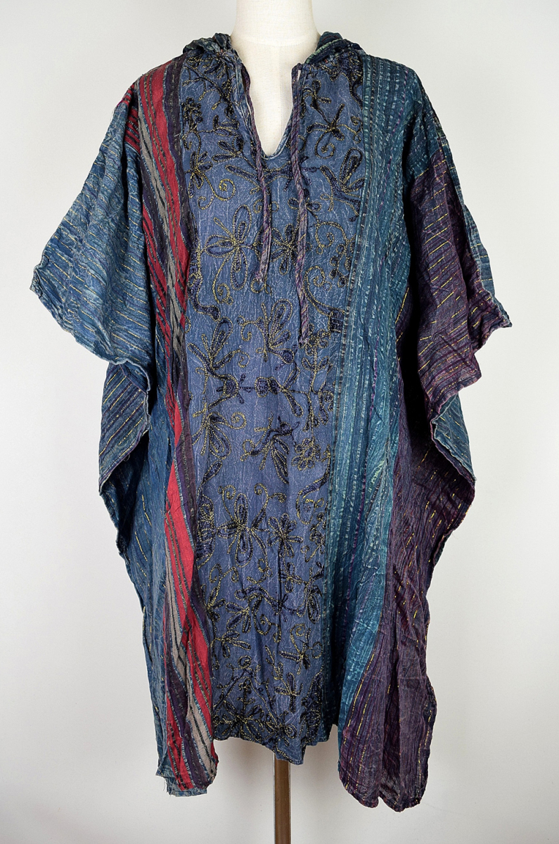 【閉店SALE】W09【レディースエスニックポンチョ】ブルー紺系色 ストライプ 半袖 パーカー フリーサイズ アジアン サマードレス