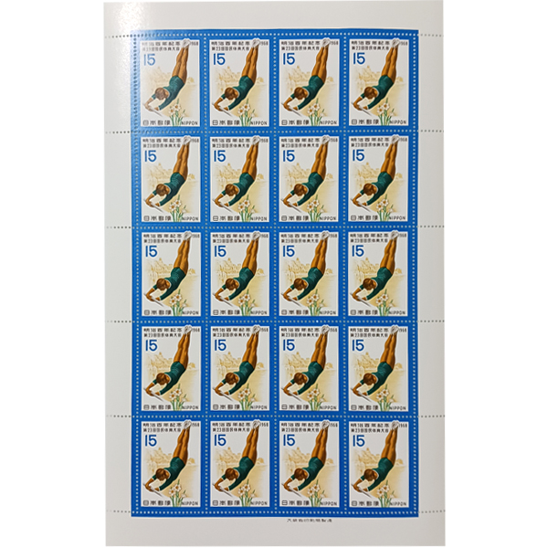 無くなり次第終了 大蔵省印刷局製造「明治百年記念 1968年 第23回国民体育大会 体操選手と水仙」15円×20枚 1シート 宝の山やコーナー