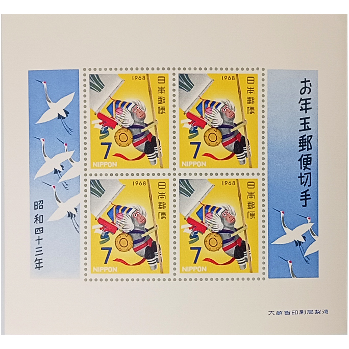 無くなり次第終了「お年玉切手 1968年 昭和43年 申(さる)7円×4枚 1シート」宝の山やコーナー
