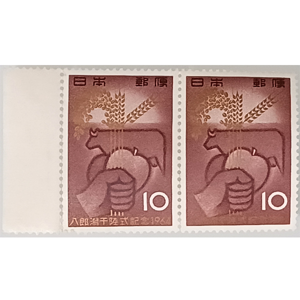 ■現品限り 記念切手 大蔵省印刷局製造 1964年 秋田県 八郎潟干陸式記念 10円×2枚 バラ 断片 ブロック 宝の山やコーナー
