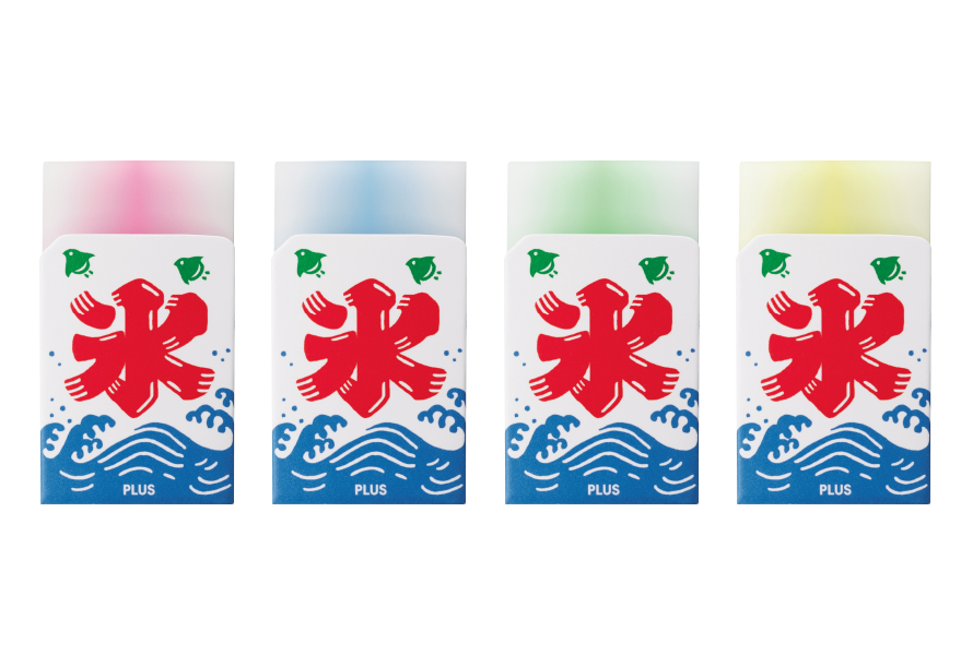 左右・前後方向にバランスよく消していくと、消しゴム本体が丸みを帯びて、冷たくておいしそうな「かき氷」の出来上がり!半透明樹脂の氷に、ネオンカラーのシロップで楽しさを演出しています。シロップは、イチゴ、ブルーハワイ、レモン、メロンの4種類。縁日風のちょっぴりレトロなケースも、お祭り気分を盛り上げてくれます。