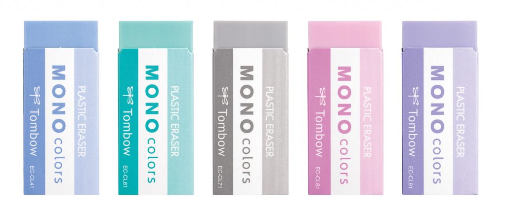 サイズは選ばれることの多い「中サイズ」(サイズ:23×11×55mm/品番:PE-04Aと同じ)1種。カラーは、(上写真左から)ブルー、グリーン、グレー、ピンク、パープルのさわやかな基調の5色です。当社がモノ消しゴムの基材を多色化するのは初です(黒の無彩色は除く)。