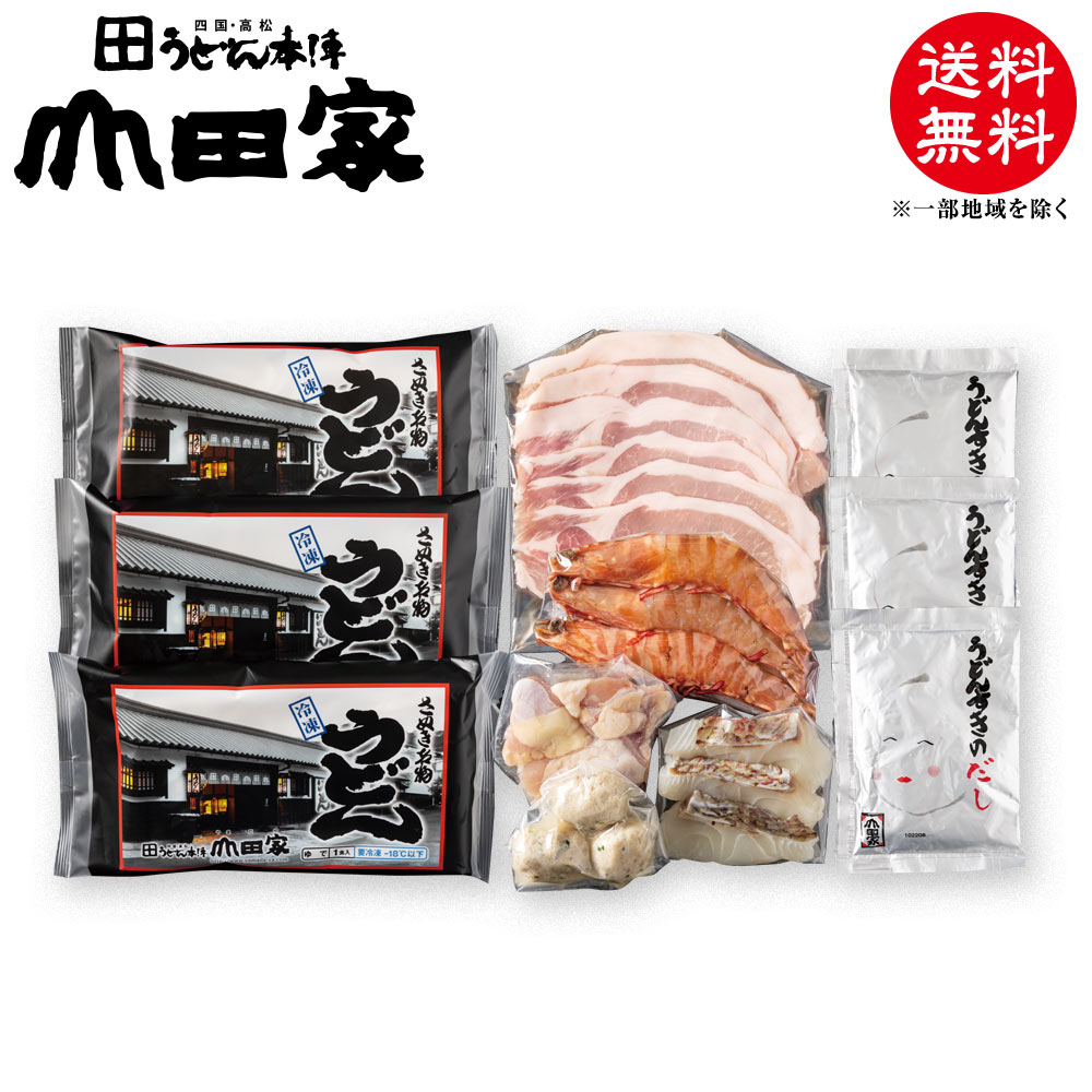 | 冷凍讃岐うどん1人前200g、本造り「うどんすきのだし」、海老(オーストラリア産・天然)、鶏肉(徳島県産阿波尾鶏)、鶏だんご(香川県産種鶏使用)、真鯛(瀬戸内産)×各3、豚ロース(香川県産オリーブ豚)×6 |