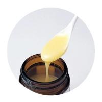 | ローヤルゼリーとは? 働き蜂が花から集めた「花粉」を体内で消化・分解・生成し、下咽頭腺と大あご腺から分泌したものです。 生成される生のローヤルゼリーは、舌を刺すような酸味のある乳白色のクリーム状の物質で、生成の過程や成分から、はちみつとは全く異質のものです。 |