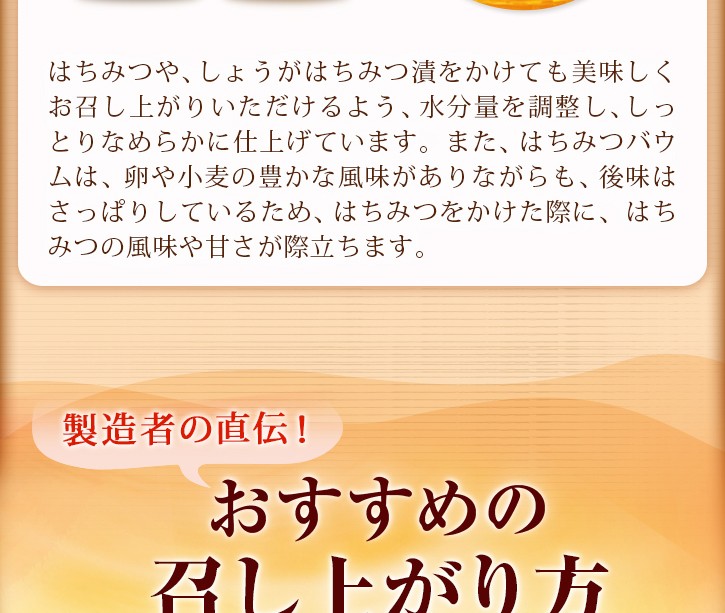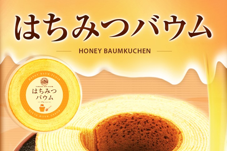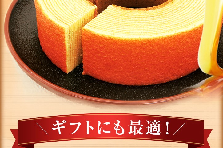 人気のルーマニア産「アカシア蜂蜜」を生地に練り込んだ、しっとりとした食感と美しい焼き色が特長のバウムクーヘン。