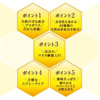 | 原材料名 | エタノール(国内製造)、還元麦芽糖水飴、還元パラチノース、プロポリスエキス、はちみつ、混合ハーブエキス、混合植物エキス、エキナセアエキス、レモンバームエキス、タイムエキス、ローズヒップエキス、ローズバッツエキス、カリンエキス/甘味料(ステビア)、アルギニン、緑茶エキス、ペパーミント香料 |