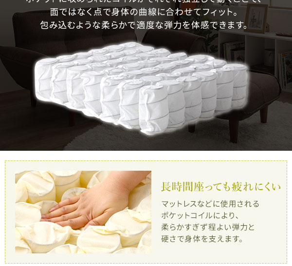 マットレスなどに使用されるポケットコイルにより、柔らかすぎず程よい弾力と硬さで身体を支えます。