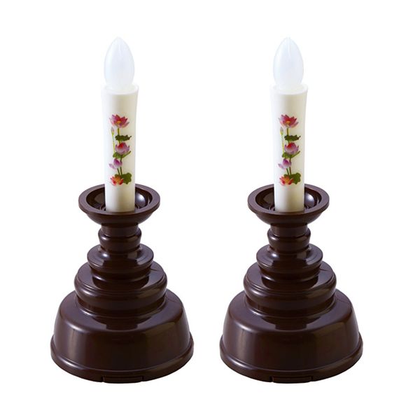 火事で見過ごしがちな、仏壇でのロウソクや線香の火ですが、「ついうっかり」では済まされません。火事にでもなれば大変なことです。本品は、火を使わないLEDのろうそくです。マッチ、ライター、配線も不要の乾電池式で、炎部分をポンと押すだけで点灯・消灯します。高輝度LEDを採用しているので球切れの心配がなく、明るさ長持ちです。サイズはコンパクトで、小型の仏壇でもお使いいただけます。蓮がろうそくに描かれていて仏壇を華やかに演出してくれます。電池寿命は、国内メーカー製アルカリ乾電池使用で60時間(1日15分使用で約7ヶ月間)です。仏壇だけでなく、小型で携帯しやすいので、お墓参りでのご使用もオススメです。
