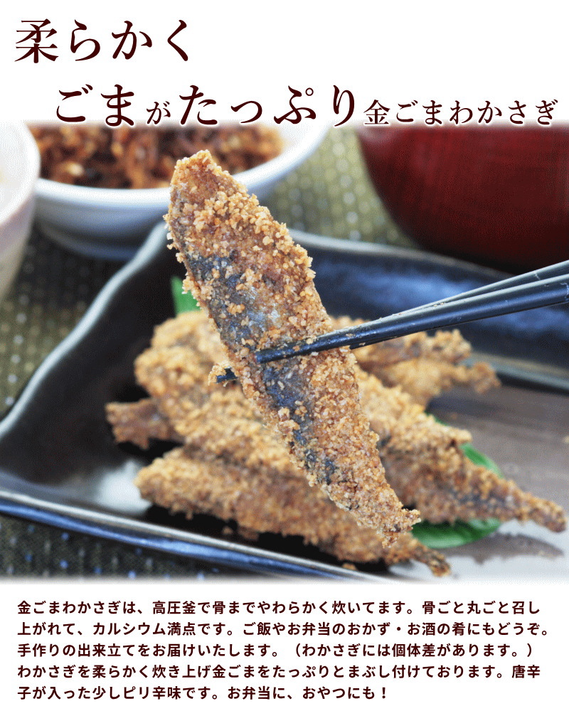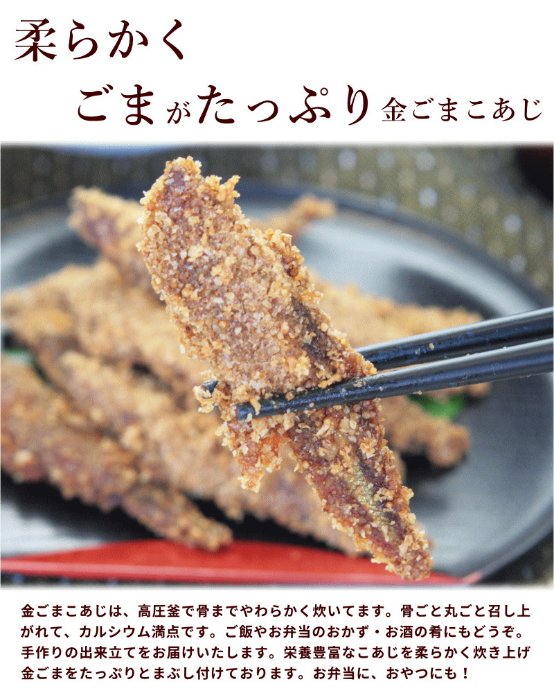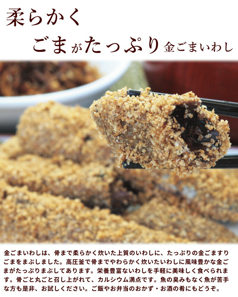 骨まで柔らかく炊いた上質の魚に、香り豊かな金ごますりごまをたっぷりまぶした金ごま惣菜詰合せです。