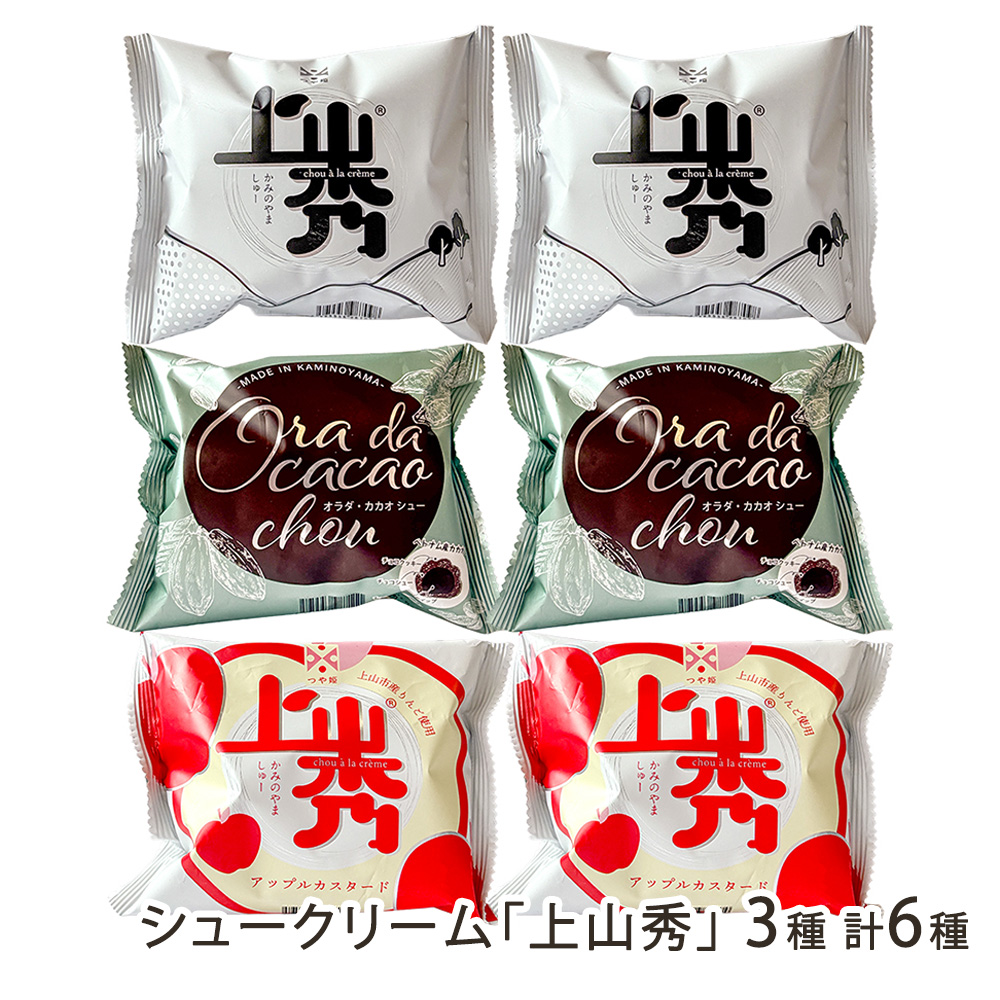 | 内容 | シュークリーム「上山秀」3種 計6個 商品内容:「カスタード」「オラダ・カカオ」「アップルカスタード」各2個 |