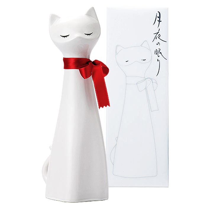 猫とお酒を愛する方にいかが。真っ白な陶器の猫ボトルに入った純米酒
