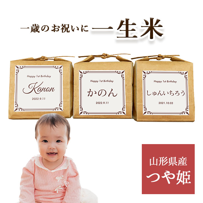 | ■ 一生米(一升米)とは? | 1歳の誕生日に健やかな成長を祝う伝統行事です。 「こどもが一生食べ物に困らない様に」 「こどもが一生健やかに育ちます様に」 といった願いがこめられています。 当商品(500g×3袋)を風呂敷やリュックなどでお子さまに背負わせるのが一般的です。 立っても転んでも縁起がいいのが一生米です。家族みんなで見守ってくださいね。 また、一生米と一緒にお子さまの将来を占う「選びとり」という行事もあります。 | | ■ つや姫について | 真っ白ごはん、お茶碗一杯そのまんまが「ごちそうになる」。 山形県が10年の歳月をかけて開発した品種です。 最大の魅力は、抜群の食味と美しい外観。 炊きあがりがふっくらつややかで粒立ちも非常に大粒。 噛むほどにじんわりと甘みが伝わってきます。 白ご飯だけの味をしっかり楽しむことができるので、そのまま食べても、日本食などの薄味の料理とも相性抜群です。 | | ■ 特別栽培米とは? | 農薬と化学肥料の窒素成分を、山形県の一般的な慣行農業レベルより5割以上削減したお米のこと。 米シスト庄内では、特別栽培認定を山形県から毎年受けているだけではなく、さらに厳しい 栽培基準を独自設定しています。 | | ■ 米シスト庄内とは? | 米シスト庄内は、平成10年の創業以来「全量・全品種 特別栽培米」に強くこだわっています。 美味しさはもちろんのこと、身体にも自然にも優しい米作りに取り組んでいます。 | | ■ 産地 | 山形県 | | ■ 生産者 | 株式会社 米シスト庄内(べいしすとしょうない) 〒999-7766 山形県東田川郡庄内町久田字寺前8 | | ■ その他 | 生産地直送のため、他の商品と同梱不可 開封後は冷暗所に保管の上、なるべく早めにお召し上がりください。 のし・ラッピング不可