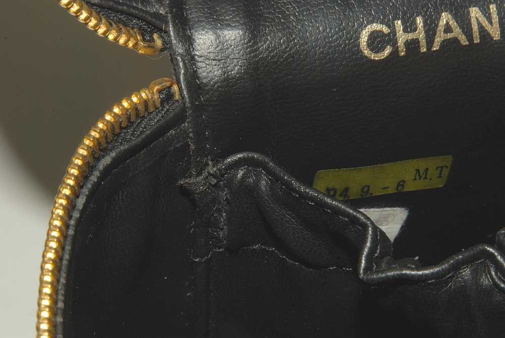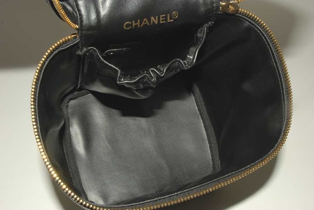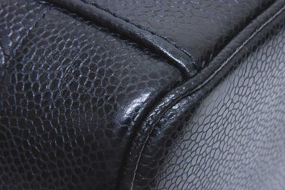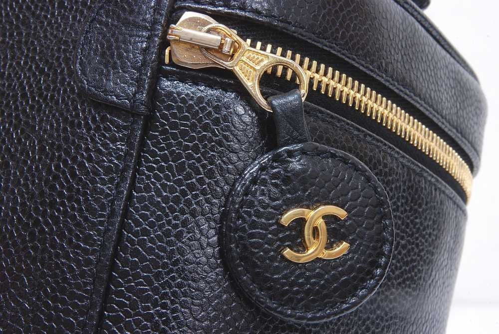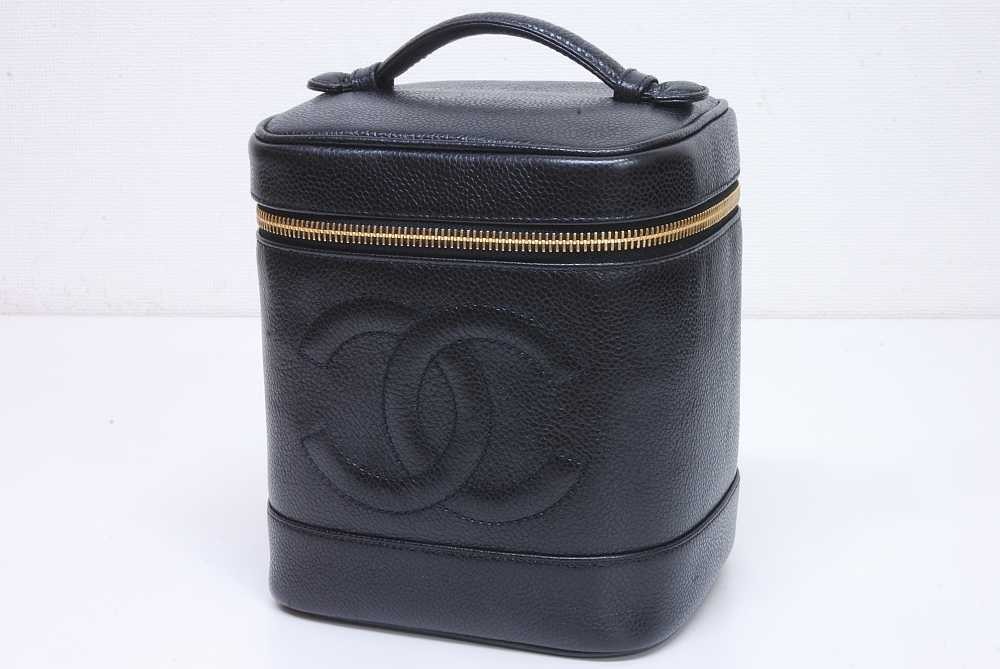 キャビアスキンにココマークがデザインされた縦型バニティバッグでございます。外側に僅かな角スレや表面に薄いスレ、ファスナーに僅かな変色が見られます。内側ポケットに型崩れや縁に僅かなホツレが見られる箇所がございますが、使用上目立つ大きなダメージや汚れ等はございません。