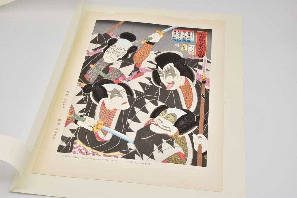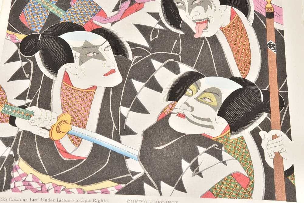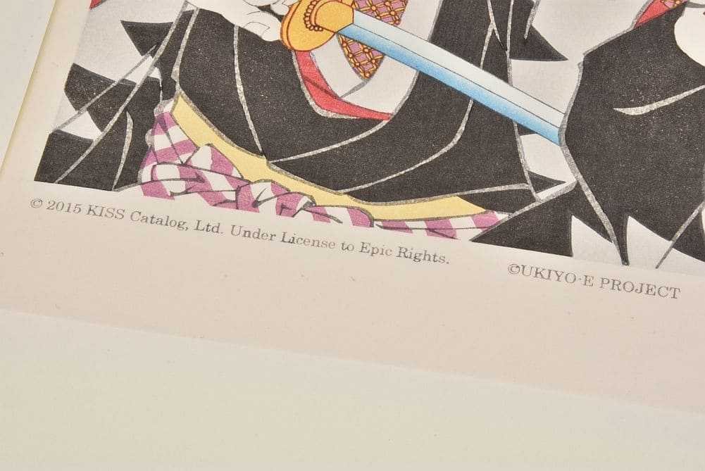 題名通り、本作品はメンバー4人の大首を合わせた構図。着物の柄は赤穂浪士をベースにしています。本来は白い部分を鼠色に雲母(きら)で光沢をだし、KISSらしさを表現しました。鎖帷子の中の色はメンバーそれぞれのイメージカラーにしています。メイクの色合いは、あえて実際より薄くして歌舞伎の隈取りの様に仕上げました。本作品は、一点一点、手作業で制作されています。そのため、摺り上がりの調子が微妙に変わりますが、木版画の特徴の一つでもありますので、独特の風合いとしてお楽しみください。絵の縁に僅かな変色、額装アクリル板に少々のスレが見られます。