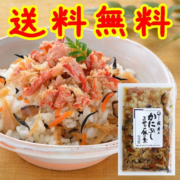 | 内容量 | 145g| 原材料 | しょう油、かに、にんじん、たけのこ、ごぼう、油揚げ、砂糖、清酒、カツオエキス、コンブエキス、植物油、乾しいたけ、乾燥ひじき(一部に大豆、小麦を合む) | 賞味期限 | 常温180日 | 保存 | 冷暗所にて保管,開封後はお早めにご利用下さい | 製造者 | 井上商店 | 商品説明 | ●炊き上がったご飯(約2合)に本品1袋を入れて混ぜます。お好みできざみのり、ねぎ、木の芽などをあしらってお召し上がりください。 | 同梱不可 | 他のメール便はこちらです | |