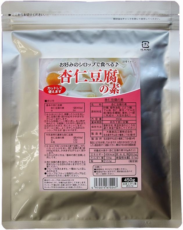| 商品説明 | 中華風デザートの定番、杏仁豆腐の素。熱湯に溶かし、冷やし固めるだけで簡単においしい杏仁豆腐が作れます。お好みの形にカットしてよく冷やしたシロップを注ぎ、お召しあがりください。シロップは、フルーツ缶詰のシロップなど、お好みのものをご使用ください。フルーツを添えますと、一層おいしく召しあがれます。牛乳を使うとより濃厚な杏仁豆腐ができあがります。 |