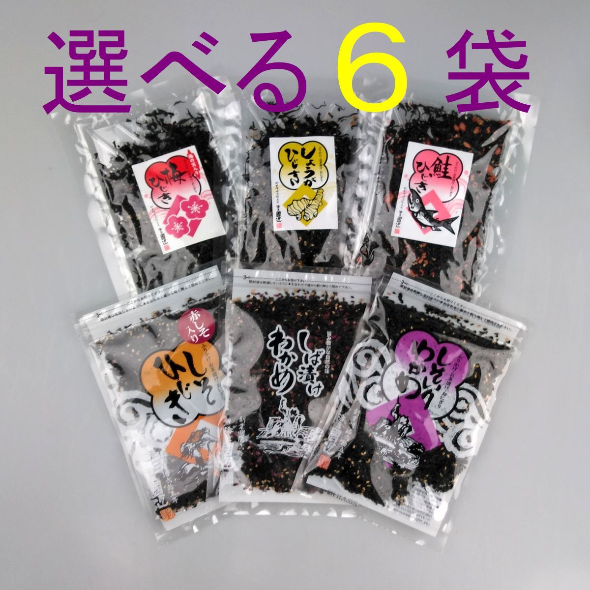 お得な選べる3袋。しそ入りわかめ、しそひじき、しば漬けわかめの中から3袋選んでください。