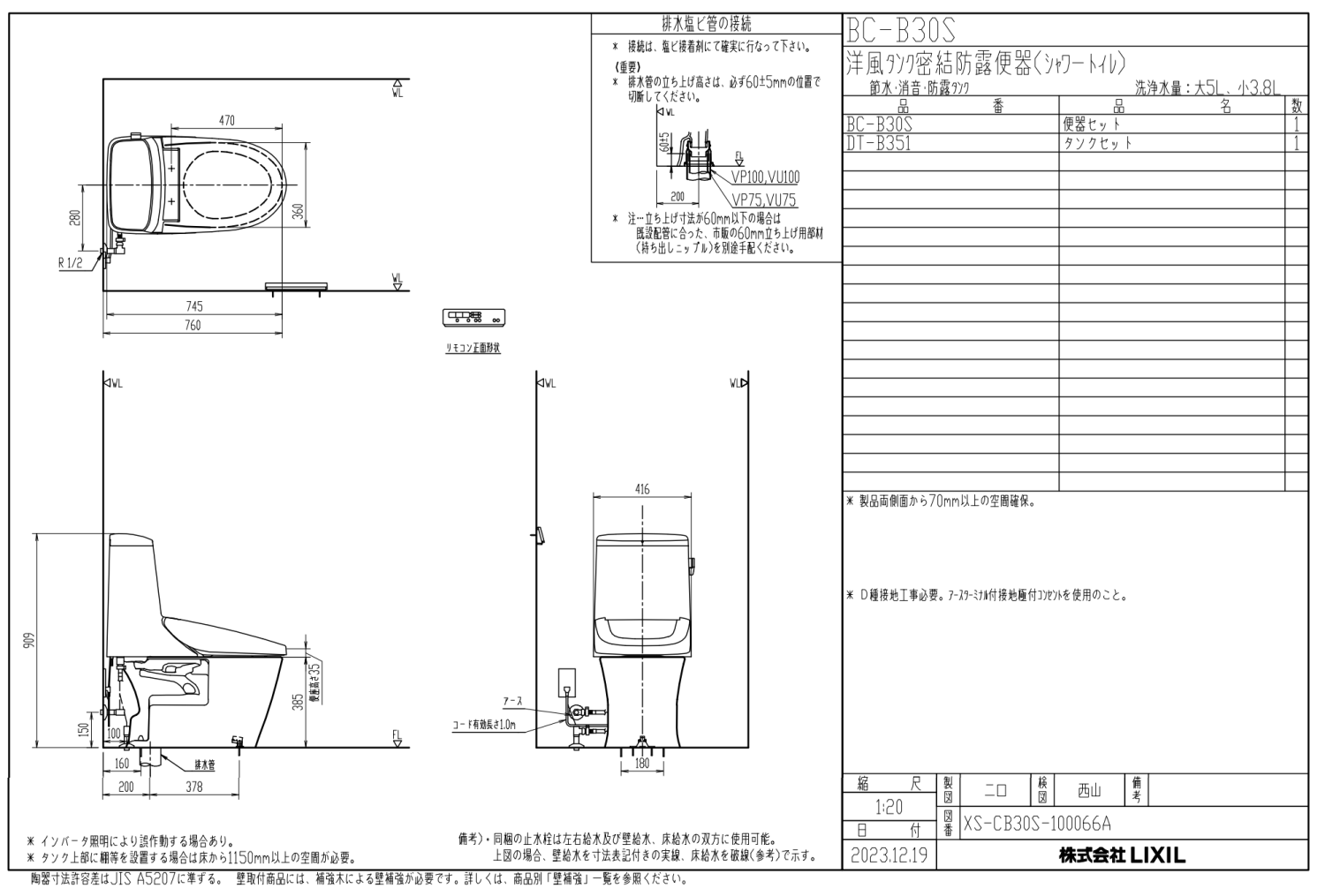 LIXIL B1 ECO5 床ベーシアシャワートイレ フチレス 一体型排水200mm 手洗無し BC-B30S_DT-B351 ホワイトBW1