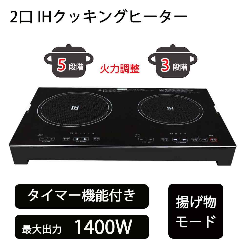 ●最大出力1400Wの高火力で本格料理ができる●2つのヒーターで料理の加熱から揚げ物まで多用途で使用できる掃除がしやすいフラットのガラストップ●タイマー機能付き左右同時調理で時短●7つの安全装置機能(マグネット式プラグ、なべ検知、なべ無し自動OFF、小物検知、切り忘れ防止、異常加熱防止、チャイルドロック)