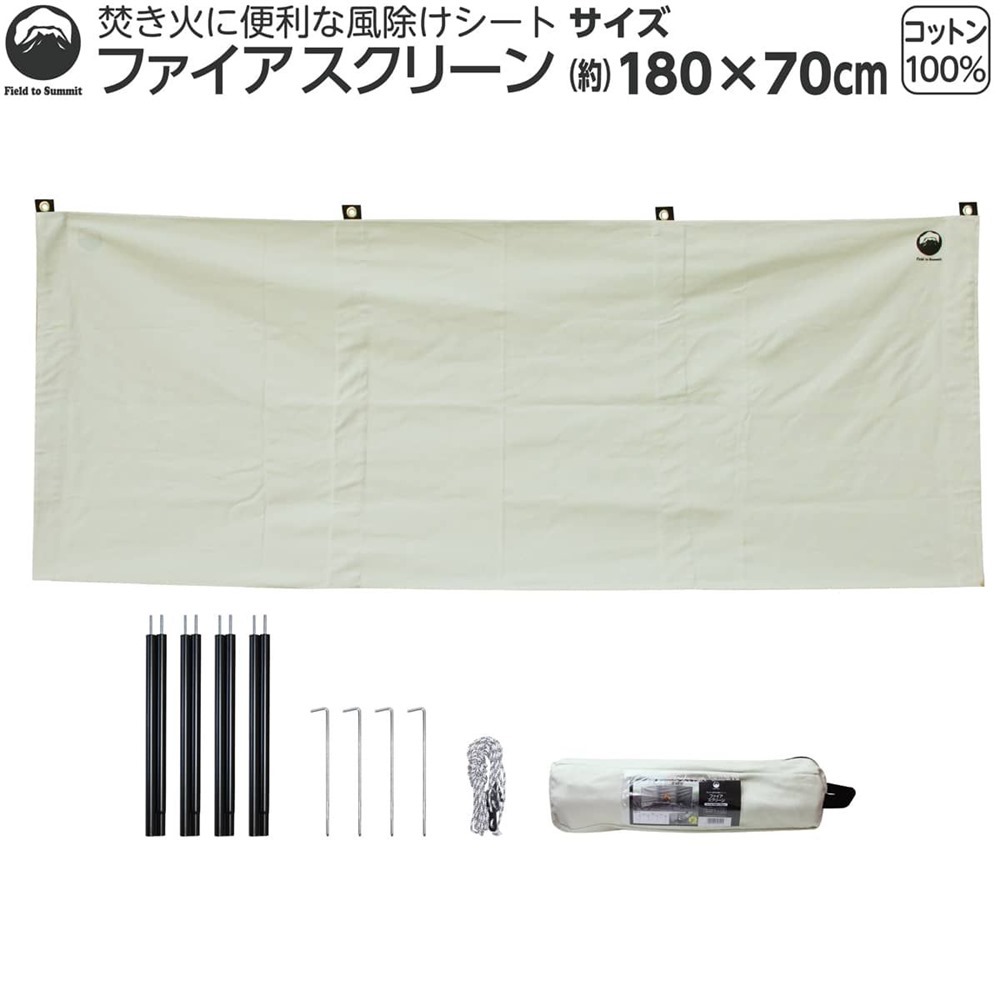 ※リニューアル等によりパッケージ・デザイン等が変更となる場合がございます。 ファイアスクリーンBE 180×70cm [アウトドア キャンプ バーべキュー 焚き火 風除け 防風] Field to Summit OF-BWF-BE ●本体(約):180×70cm ●重量(約):2kg ●焚き火に便利な風除けシートファイアスクリーン ■材質:綿100%