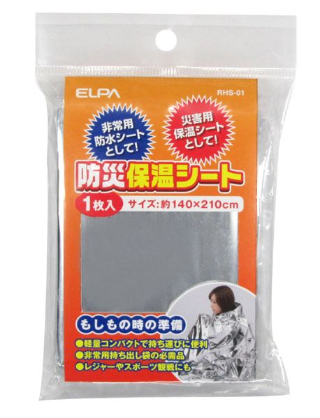 ※リニューアル等にともないパッケージや仕様が変更となる場合がございます。 防災保温シート [アルミシート エマージェンシーシート 災害 アウトドア] 朝日電器 ELPA(エルパ) RHS-01 ●サイズ(約):幅140×長さ210cm ●1枚入 ●緊急時の気象の変化や風雨から身を守る軽量緊急用シートです