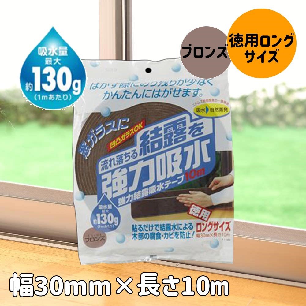 強力結露吸水テープ 10m ブロンズ [窓 サッシ 水滴 幅30mm 幅3cm] ニトムズ E1120 ●商品サイズ:厚み4.5mm×幅30mm×長さ10m ●入数:1巻入 ●窓に貼るだけで窓ガラスの結露を強力吸水