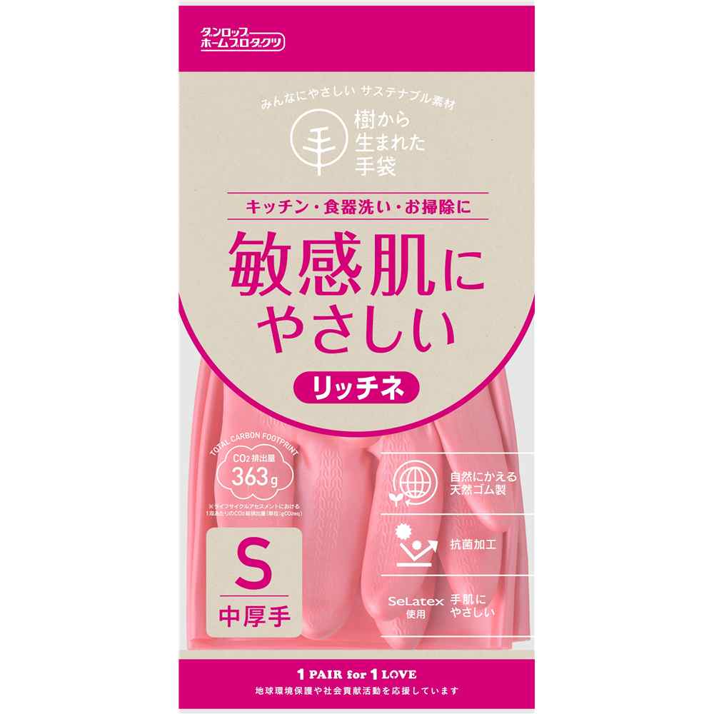 ※リニューアル等によりパッケージ・デザイン等が変更となる場合がございます。 樹から生まれた手袋 リッチネ 中厚手 Sサイズ ピンク [ゴム手袋 敏感肌 掃除 園芸 男女兼用] ダンロップホームプロダクツ 1双 ●全長:33cm