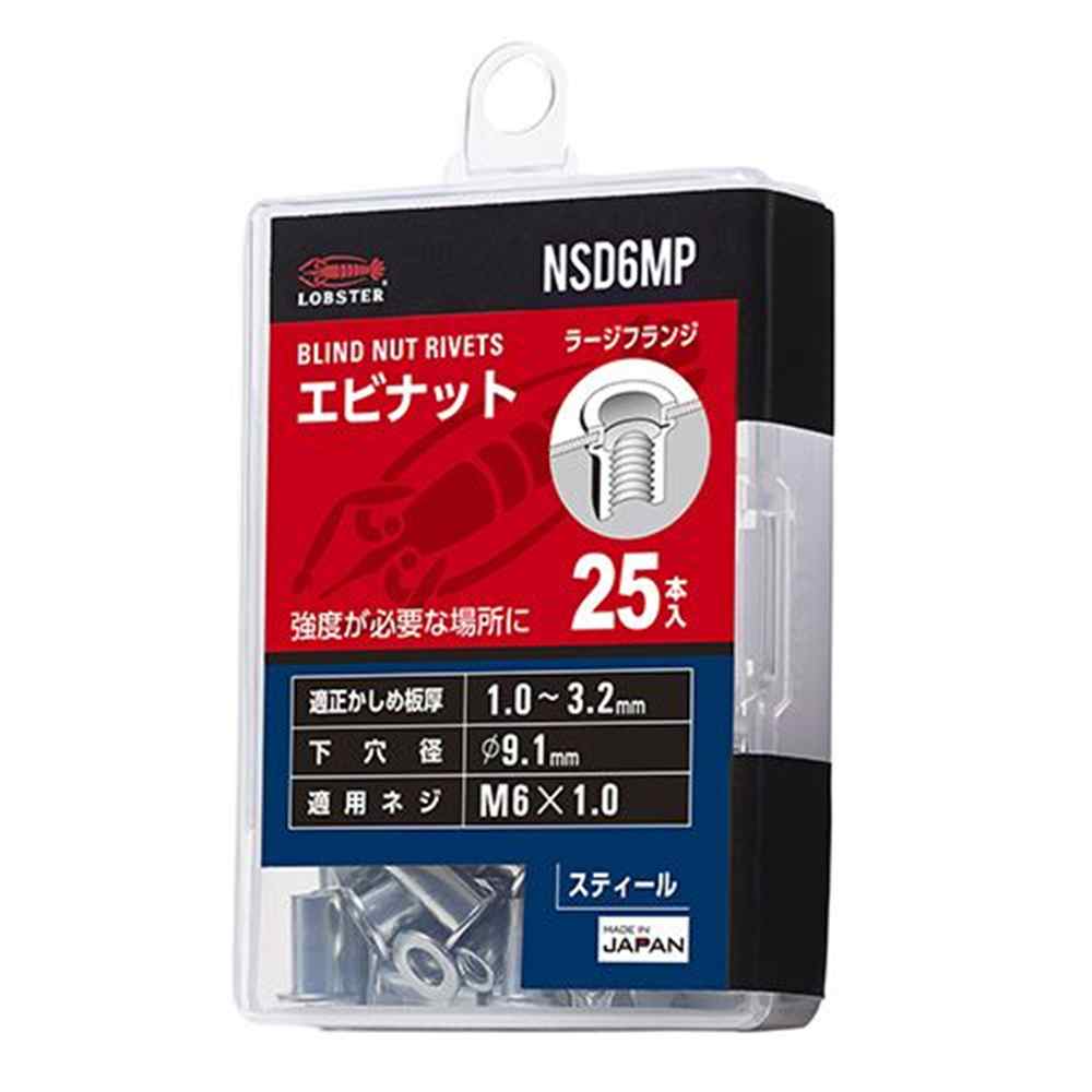 ※リニューアル等によりパッケージ・デザイン等が変更となる場合がございます。 エビナット ECOパック [作業工具 金物 部品 ブラインドナット] エビ NSD6MP ●入数:25本 ●タップ立てのできない薄板やポイプ、角パイプ、溶接のできないポラスチック板にも片側から、簡単に取り付けられます
