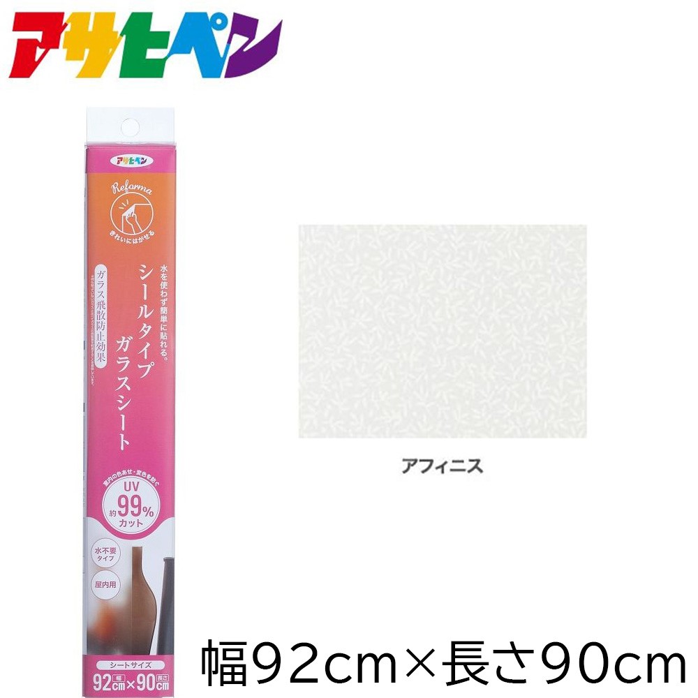 シールタイプガラスシート (92cm×90cm) [窓ガラス フィルム UVカット 飛散防止] アサヒペン SGS-102 アフィニス ●サイズ(約):幅92cm×長さ90cm ●特殊構造シートなので、気泡を残さず、簡単に貼れます