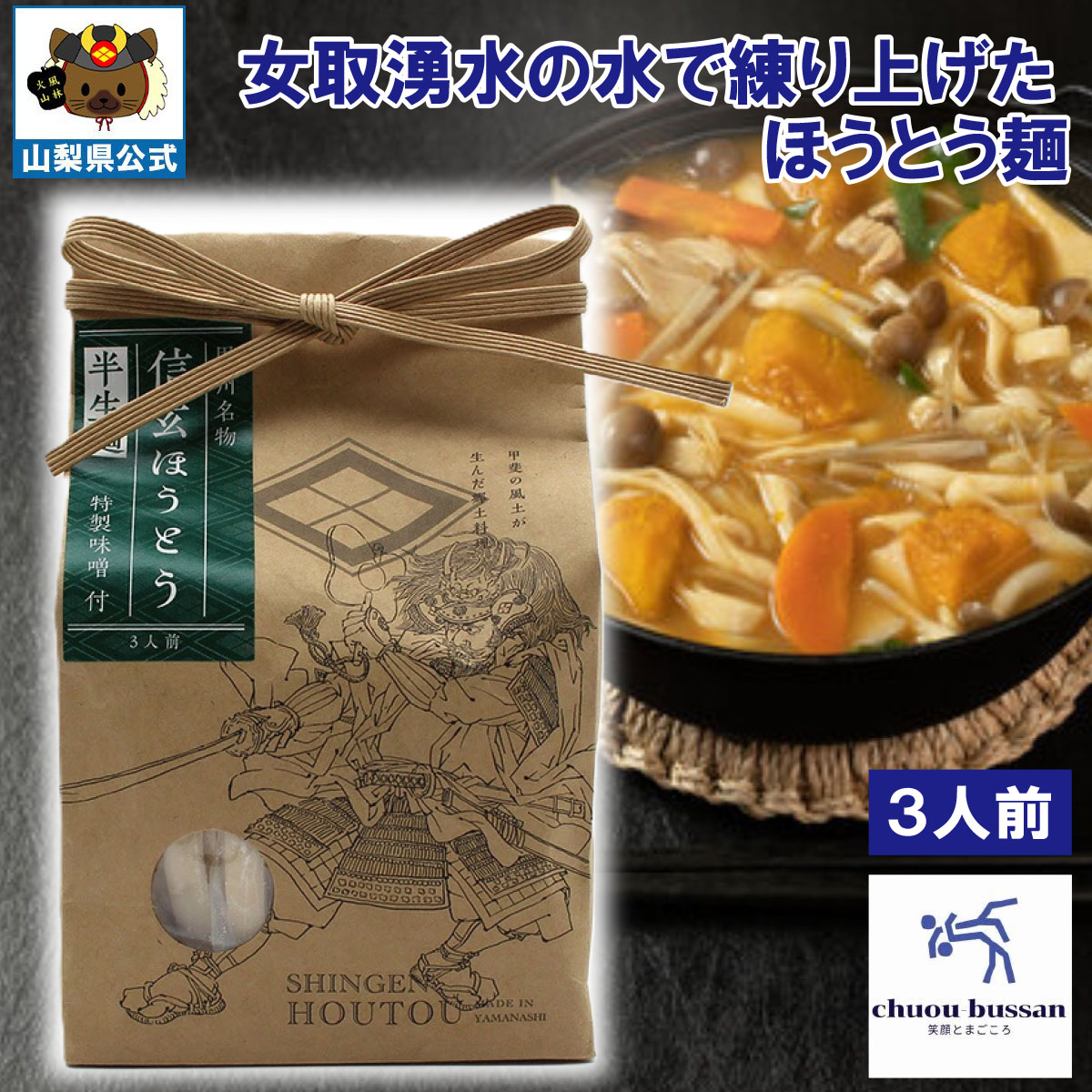 八ヶ岳南麓湧水群の一つ”女取湧水”の水で練り上げたほうとう麺。幅広・肉厚の麺が特徴で、もちもちとした食感が楽しめる商品。高級感もあり信玄の顔の迫力がなんとも言えません…。麺はもちもちしていて味噌がよく染み込みます。