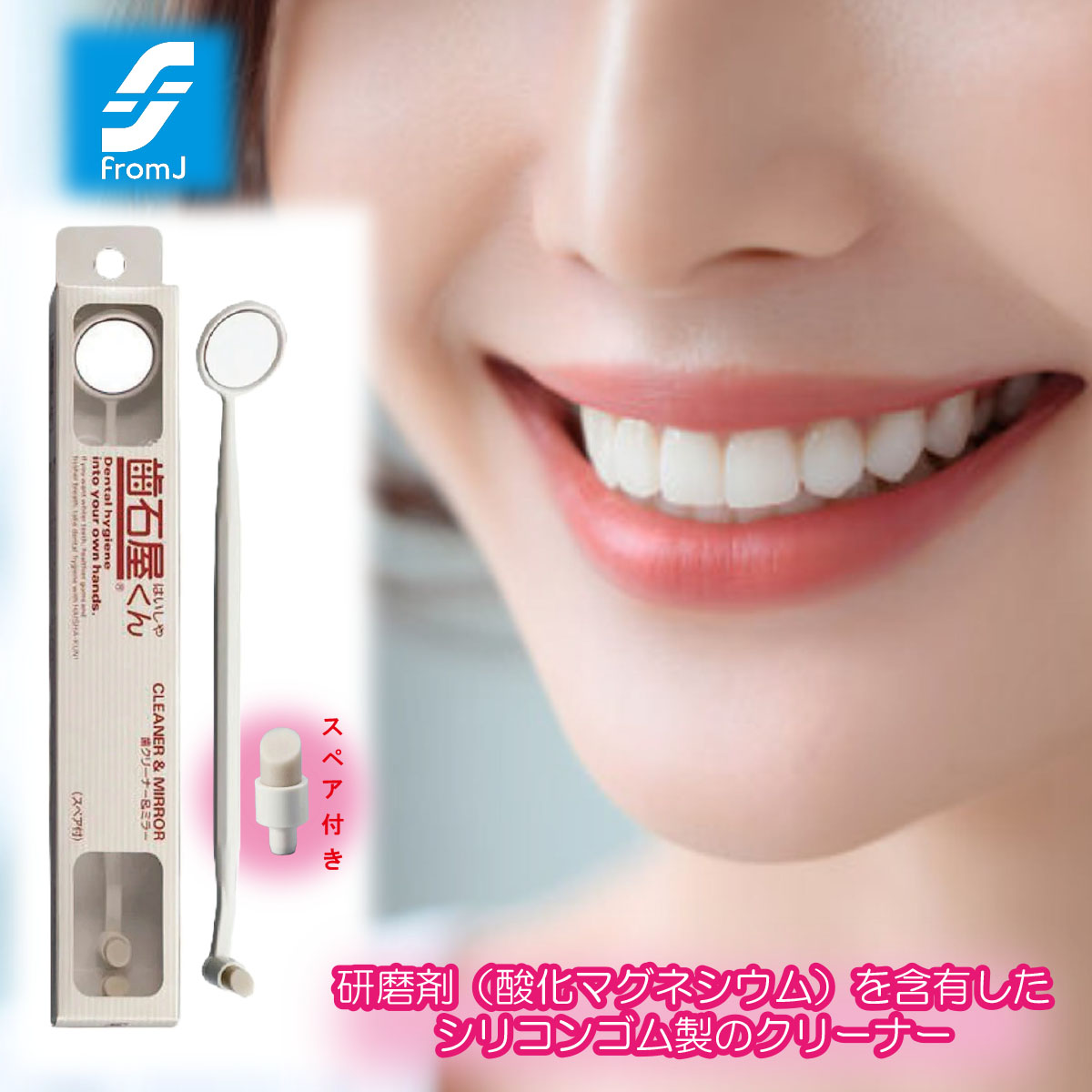 歯の裏側をチェックするミラーと、軽くこすってヤニ、茶シブ、ステインの除去に力を発揮する、研磨剤(酸化マグネシウム)を含有したシリコンゴム製のクリーナーを組み合わせた歯の清掃具です。 挿入部は本体柄部に対し15° 傾斜しているので、クリーナーを柄にセットする方向によって2種類の角度で使用できます。 クリーナーは交換式で、スペアが1本ついています。