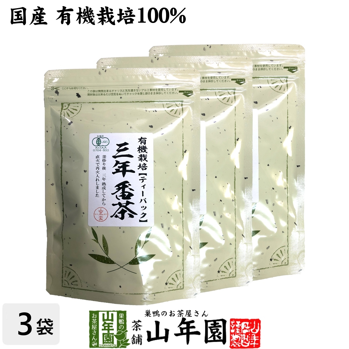 | 三年番茶! 巣鴨のお茶屋さん山年園の 「三年番茶」は、 国産の原材料使用で 安心・安全にお召し上がりいただけます。 当店の「三年番茶ティーパック」は 山年園限定です。 老舗のお茶屋がこだわり抜いた 「三年番茶ティーパック」を 是非ご賞味ください(^-^) |