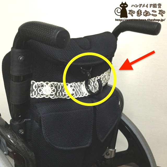 ただし、杖ホルダーを取り付けている場合は、ホルダーの横ベルトを利用して取り付けられるようです。