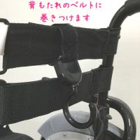 車椅子の背もたれ中央に、マジックテープのベルトで取りつけるしっかりベルトフック。