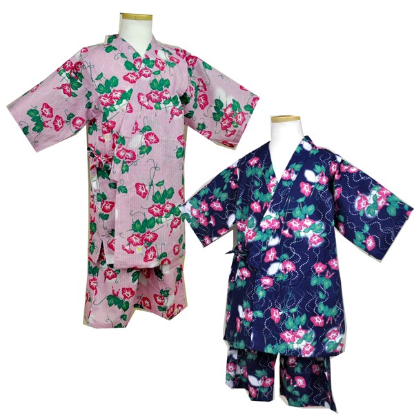 女の子 こども 甚平 じんべい 上下セット あさがお 絵柄 シャドーストライプ 生地 全2色 サイズ 110 120 130