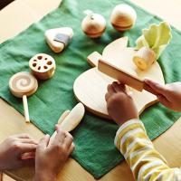 リンゴのまな板の上でサクサクと、繰り返し遊んでも切れ味が変わらないように、接着面にはマグネットを使用しています。ヒノキやスギ、サクラ、ケヤキ、カヤ、そして職人が一つ一つ染め上げた草木染めフェルトを使用。素材にもこだわり、自然のぬくもりを感じながら楽しく遊んでもらえるように一点一点作り上げました。ひとり遊びだけではなくお友達や家族とも。ごっこ遊びやままごとを通して、好奇心、お手伝い、食育、生活習慣や手指の発達などにも。 小さなお母さんのままごとは、お子さまにとって大切な遊びです。