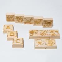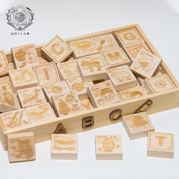 やさしい木肌と手触りの高知県産ヒノキのつみきに、山のくじら舎オリジナルの楽しいイラストと覚えやすい形のアルファベット(大文字・小文字)を刻みました。アルファベットを覚えたり、言葉をつくったり、ゲームをしたり、いろいろな遊びを通してお子さまと英語の距離感を縮めていきましょう。