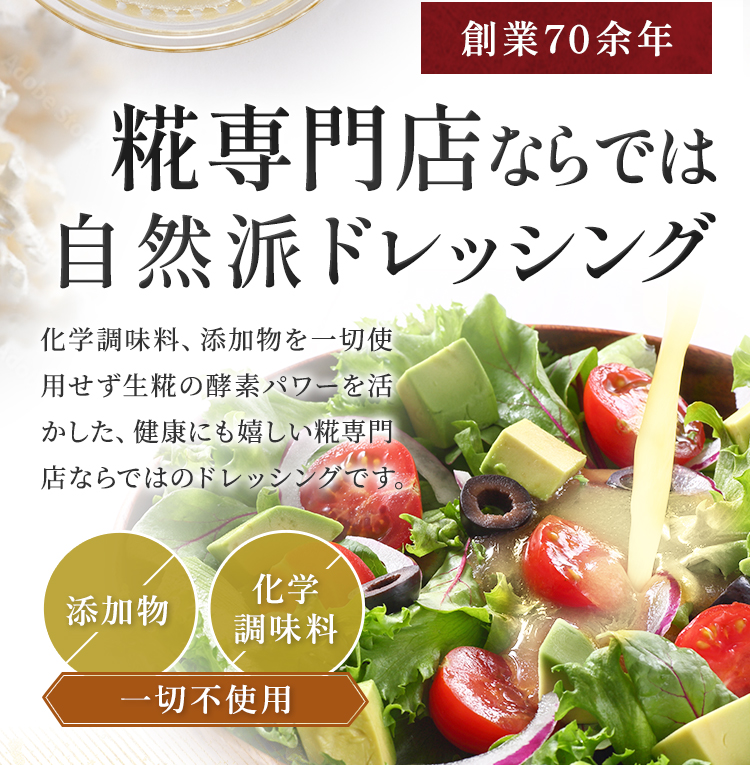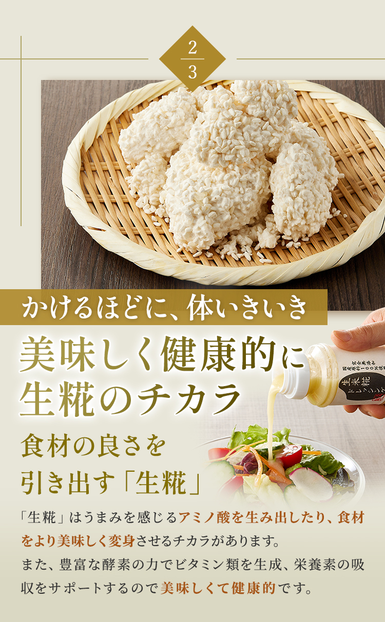 『美味しく健康的で美しく』を叶える自然派ドレッシング。『生糀』は豊富な酵素の力により、食材の旨味を引き出すと共にビタミン類を生成し、栄養素の吸収を高めます。