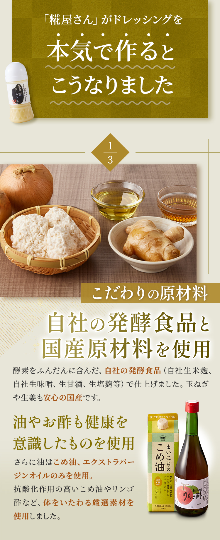 ■原材料名:生塩糀、こめ油、オリーブオイル、リンゴ酢、玉ねぎ、砂糖、甘酒、糀、生姜、食塩、はちみつ