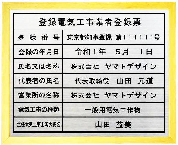 登録電気工事業者登録票看板のヤマト。登録電気工事業者登録票はヤマトデザインヤフー店へ。真鍮プレートゴールド額入り・アクリルW式など種類も豊富に取り揃えています。