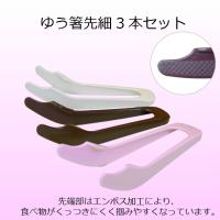 | ゆう箸とは 箸・フォーク/ナイフで食べにくい食べ物も簡単に楽しんで食べられる第3の 食器です。 例えば、寿司、天ぷら、焼き鳥、野菜サラダ、豆腐、豆類などからパスタなど の麺類まで、持ち方の工夫で、あらゆる食べ物に利用できます。 繰り返し使用できます。 箸、フォーク等、先がとがっている食器では 喉をつく危険性がありますが、 「ゆう箸」は先端が丸いので安全です。 | ![]() |