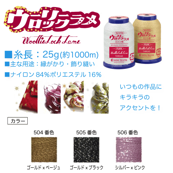 ラメ ロックミシン糸 ロック糸 縁がかり 飾り縫い 約1000m ウーリーロックラメ 25g ミシン糸 (504、505、506)