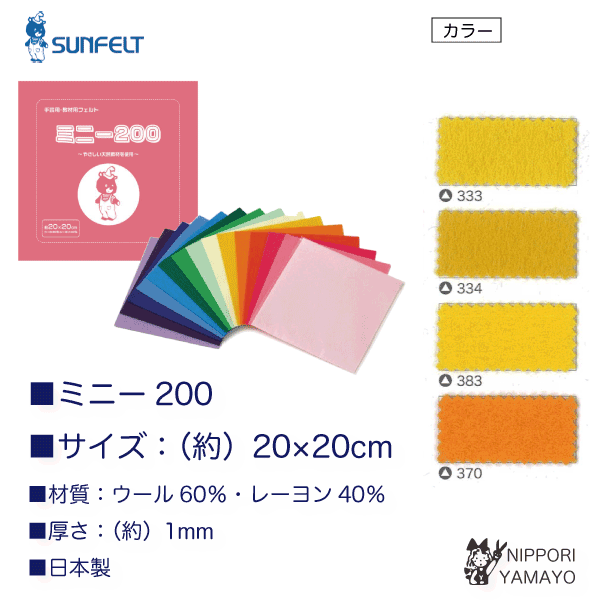 フェルト生地 カラーフェルト 1mm フェルテース ミニー200 約20cm×20cm 黄色 イエロー
