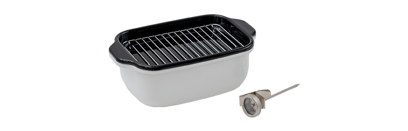 食材の下ごしらえに使ったり油を切るのにも使えるバットとスノコ網、防水でまるまる洗える温度計付き。
