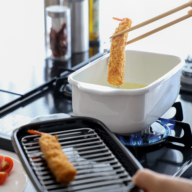 おうちでの揚げ物をもっと気楽に楽しめる富士ホーローの「角型天ぷら鍋」です。
