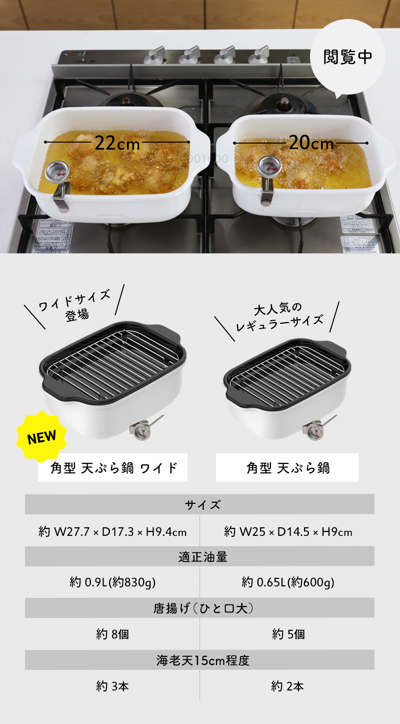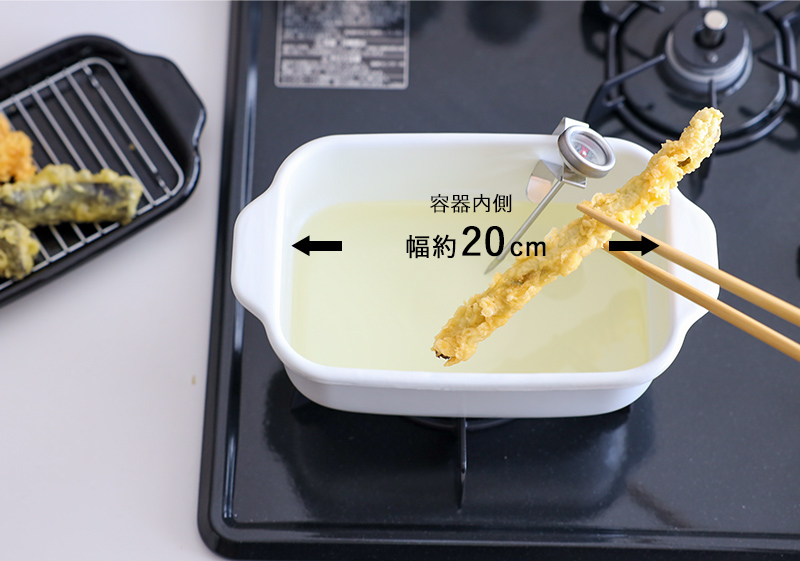 エビ天などもまっすぐ揚げられる幅20cmのスクエア型。他にもアスパラやゴボウ、白身魚など長さのある食材にもストレスなくお使いいただけます。